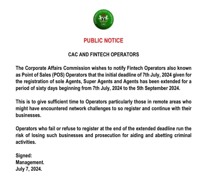 We've got good news for Point of Sales (POS) operators in Nigeria! The Corporate Affairs Commission (CAC) has extended the deadline for registration by 60 days. The new deadline is now September 5th, 2024. This extension provides additional time for operators to get registered and avoid any disruptions to their business. Don't forget, failing to register by the deadline could result in the closure of your...