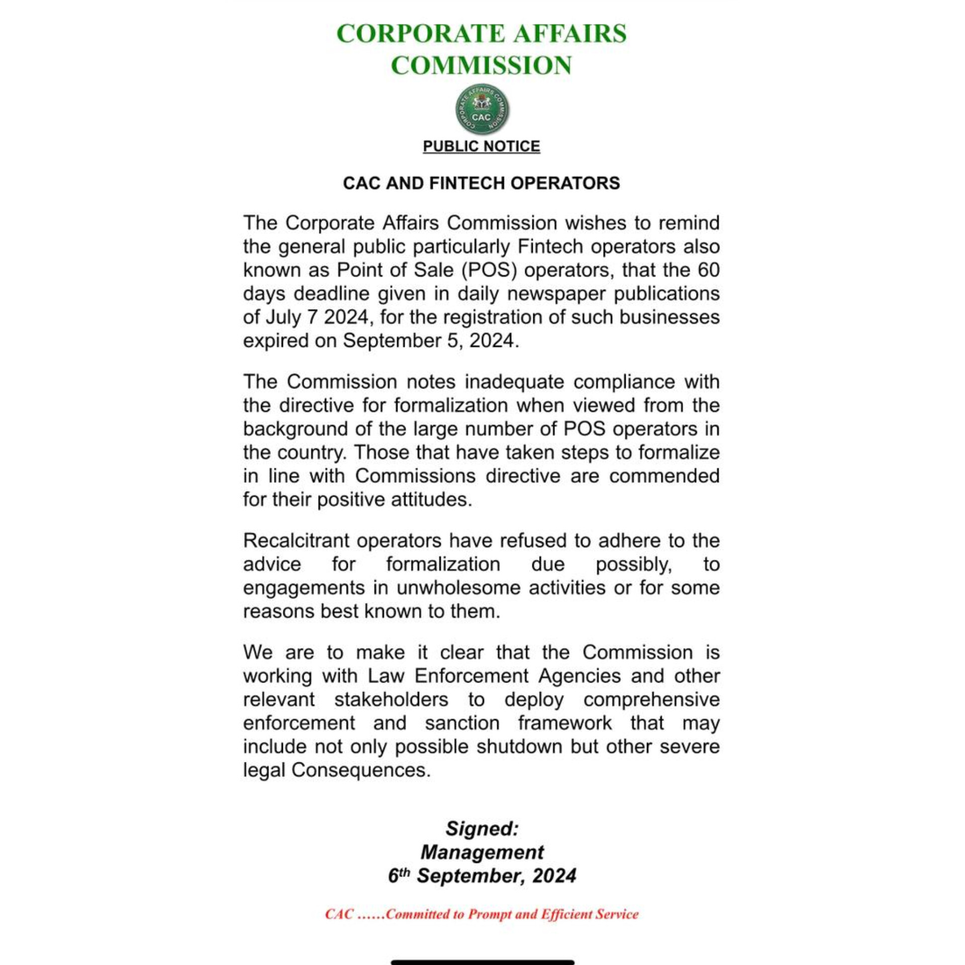 The Corporate Affairs Commission (CAC) is reminding all Point of Sale (POS) operators that the 60-day deadline for registering their businesses has expired. As of September 5, 2024, all POS operators must have complied with the Commission's directive to formalize their operations. While the CAC notes that many operators have already taken steps to comply, it also highlights the significant...