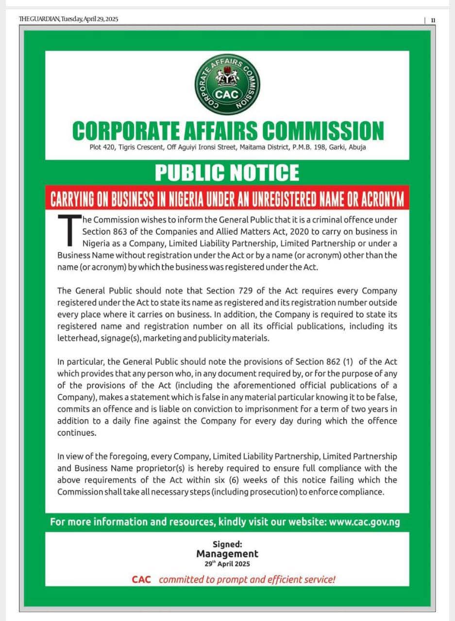In a recent public notice, the Corporate Affairs Commission (CAC) has issued a strong warning to all individuals and businesses operating in Nigeria under unregistered names, acronyms, or labels. If you're using a business name that is not properly registered with the CAC whether on your flyers, social media pages, or even on your store banner. you may be breaking the law without even knowing...