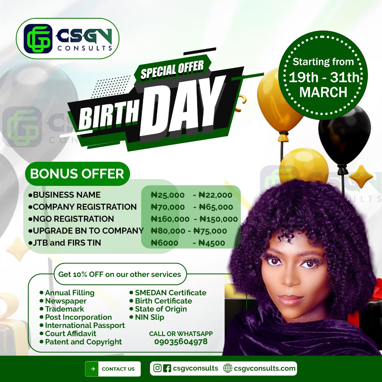 📢📢📢 Embark on my Birthday Journey with Amazing Discounts on our Services Grab incredible discounts on CAC services & business formation! ✅ 🎉 Big Savings Await 🎯 Tailored Solutions 🤝 Expert Support 🚀 Smooth Process 💼 Let's Achieve Your Goals Commencing March 19th! Dive into this stellar celebration. 💃💃💃 Contact us...